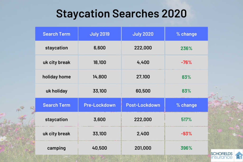 There are a staggering 5 times more searches for holidays closer to home since lockdown has ended: from January to July, searches for “staycation” have risen by 517%.